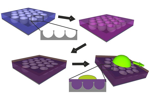 The researchers were also able to apply the SLIPS-like coating to glass slides in a pattern that confines liquid to specific areas — an ability that’s important for various lab-on-a-chip applications and medical diagnostics.