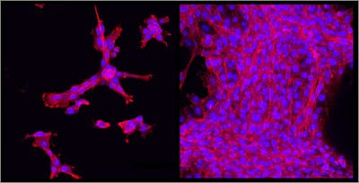 From left to right, these fluorescent images show cell adhesion, growth and spread within the novel click alginate hydrogel over the course of three days. The hydrogel, synthesized using “click chemistry”, is biocompatible and is non-damaging to the cells and molecules that can be inserted into it for drug delivery and therapeutic purposes. Credit: Wyss Institute at Harvard University