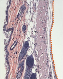 The click alginate hydrogel is robust and resists premature degradation and invasion by surrounding tissues. Pictured here, the hydrogel on the right (white space) remains intact after being injected into subcutaneous tissue (visible on the left), with the orange dotted line marking the border between the hydrogel and surrounding tissue. The hydrogel is robust enough to be used for the extended release of drugs and growth factors that could aid in tissue regeneration or other therapeutic purposes. Credit: Wyss Institute at Harvard University