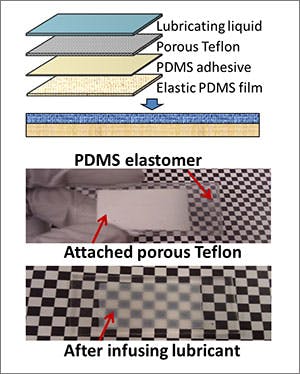But whereas SLIPS is a liquid-infused rigid porous surface, “the new material is a liquid-infused elastic porous surface, which is what allows for the fine control over so many adaptive responses above and beyond its ability to repel a wide range of substances. A whole range of surface properties can now be tuned, or switched on and off on demand, through stimulus-induced deformation of the elastic material,” Aizenberg said.