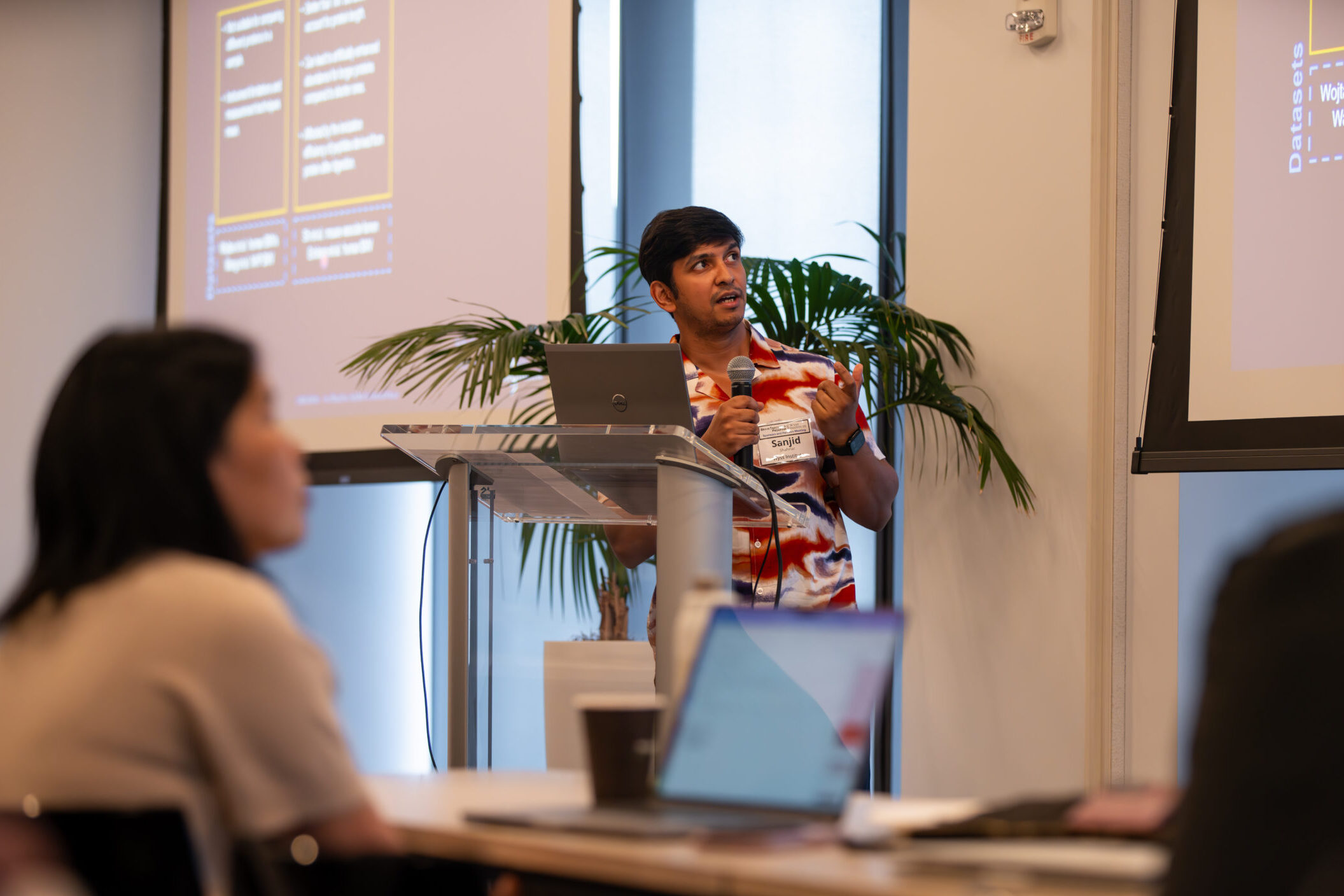 Wyss Technology Development Fellow Ana Raquel Santa Maria, Ph.D., and Scientist Sanjid Shahriar, Ph.D., presented a summary of their work. Drawing on transcriptomic and proteomic datasets, they found that expression levels of key brain transport targets are consistent across diseases and demographics, but vary meaningfully between individuals, supporting both the broad utility of these targets and the importance of understanding individual receptor expression levels. This work will be published in a forthcoming manuscript.