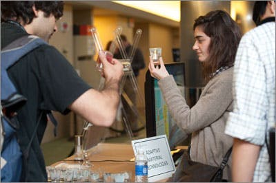 Throughout the day, the convention center resembled a science museum, with teams from the Institute’s different Platforms demonstrating their latest and greatest inventions — a vibrating mattress to prevent premature babies from dying of sleep apnea; crawling termite-like robots that could lay sandbags to stop the spread of floodwaters; a microfluidic-based pathogen capture system to prevent food poisoning and expensive food recalls, and new window materials that could shine sunlight deep into offices, pleasing workers and conserving energy.
