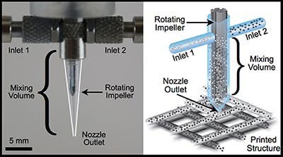 The active printhead efficiently mixes a wide range of complex fluids by using a rotational component inside a microscale nozzle, which enabled the team to print heterogeneous materials in three dimensions.