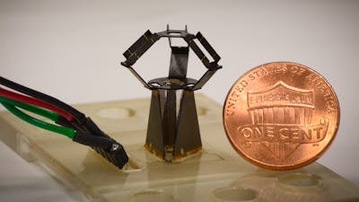 Delta robots are deployed in many industrial processes, including pick-and-place assemblies, machining, welding, and food packaging. Three individually controlled lightweight arms enable fast and accurate motion of an output platform in three directions. Roboticists have reduced the size of Delta robots for tasks in limited workspaces, but so far, using conventional manufacturing techniques and components, they have not succeeded in shrinking them down to the millimeter scale where they could be useful for entirely different applications.
